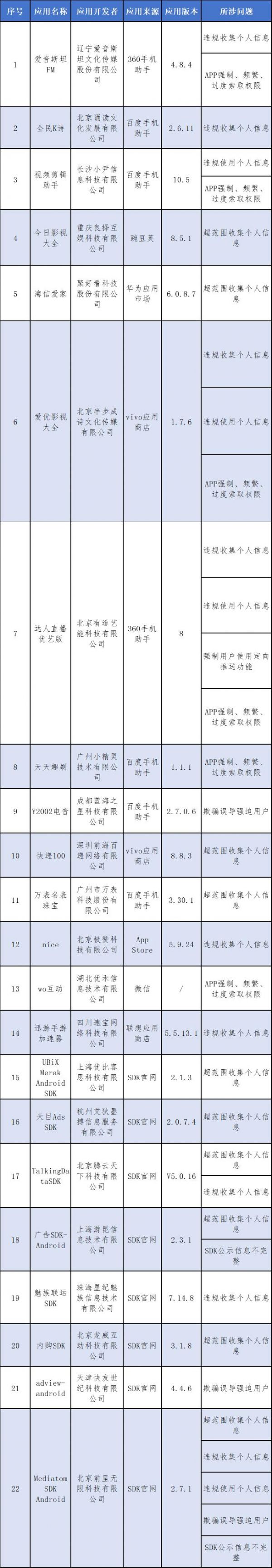 工业和信息化部通报存在问题的APP(SDK)名单