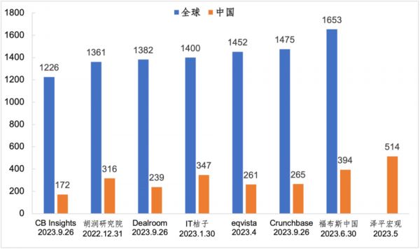 图1 不同机构统计的全球和中国独角兽数量,数据来源:腾讯研究院收集整理,2023年10月