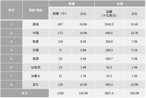 图2 全球独角兽企业分布情况,数据来源:根据CB Insights数据(2023年9月26日)整理