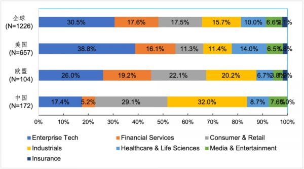 图5 全球和美中欧的独角兽行业分布,数据来源:根据CB Insights数据(2023年9月26日)整理