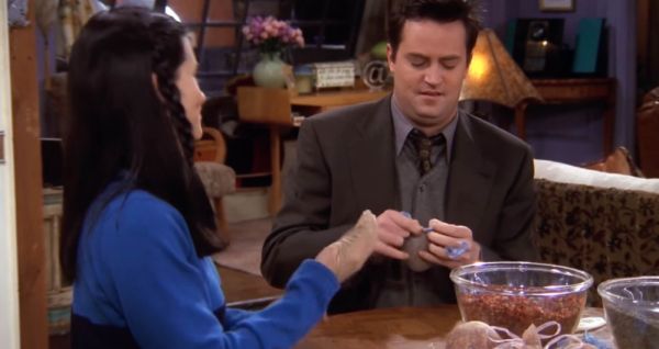 在两人的故事里,也有不少关于性别气质的笑料。结婚后,钱德勒跟随莫妮卡做香囊、洗泡泡浴,莫妮卡在派对上给丈夫穿上粉色兔子服。沾染这些“女孩子气”的事物,钱德勒微微反抗,总体上是坦然接受。编剧用这些诙谐的段子,展现出男女婚姻当中多元的可能性。
