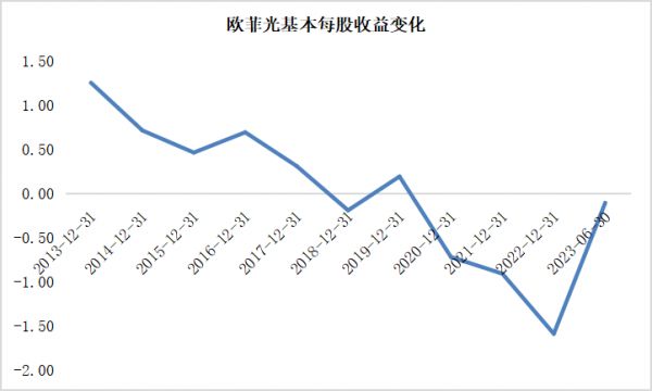 2021年,欧菲光的股价持续下跌并一直保持低位,虽近期有所上升,但始终难以恢复到高期。再从其基本每股收益变化来看,截至今年6月末,仍处于负数。