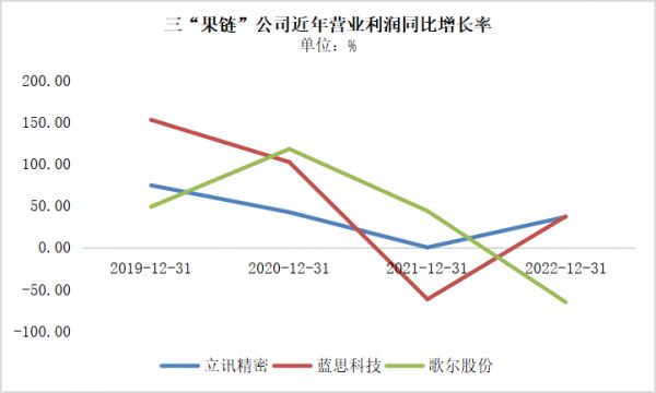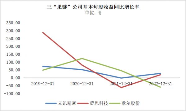 且其成长能力也明显下降。具体从基本每股收益同比增长率抑或是从营业利润同比增长率来看,其跌幅不可谓不大,尤其是蓝思科技,其基本每股收益同比增长率、营业利润同比增长率分别从2019年的287.50%、152.87%大幅跌至2021年末的-62.50%、-62.12%,即使2022年有所回升,但距离鼎盛时期相差甚大。