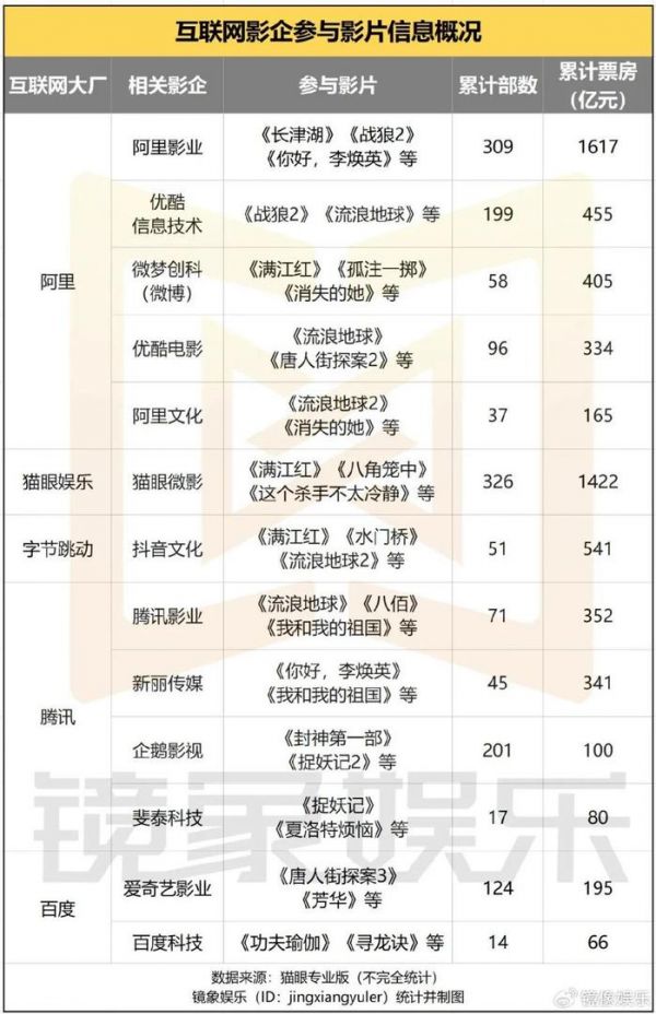 据镜象娱乐不完全统计,阿里旗下的阿里影业、优酷信息、微梦创科等公司;腾讯旗下的腾讯影业;字节跳动旗下的抖音文化等多家互联网影企,其参与影片产出的累计票房都达到数百亿元。