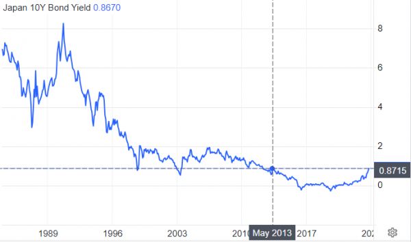 10年期日本国债收益率近日逼近0.9%,创10年新高 图片来源:Tradingeconomics