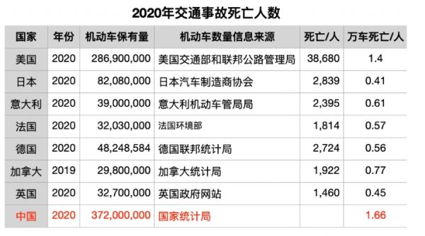 网络统计的2020年交通事故率数据对比