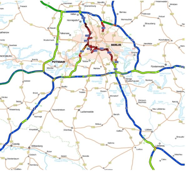德国高速限速示意图:蓝色路段为不限速,深绿色为130km/h,浅绿色为120km/h