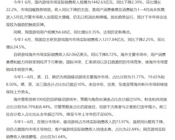 根据游戏工委发布的《2023年1-6月中国游戏产业报告》显示,2023年的前6个月,中国游戏市场实际销售收入为1442.63亿元,同比下降2.39%,环比增长22.16%,最多持平。属于寒气还没有结束的阶段。