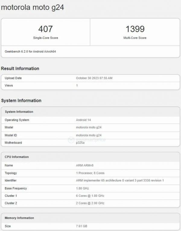 Moto G24 5G 手机将作为 Moto G23 的继任者推出,跑分库页面显示该机搭载联发科八核 Helio 处理器和 8GB 内存。IT之家注:Moto G24 在 Geekbench 6 基准测试中单核得分为 407 分,多核性能为 1399 分。