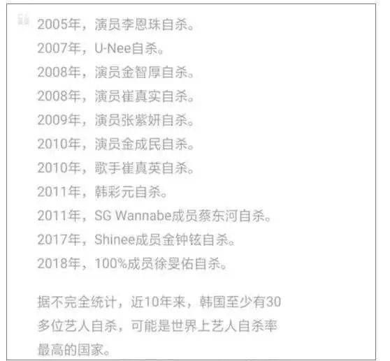 2005年至今,韩国演艺界人士自杀超30名,有40%的韩国艺人患有抑郁症。