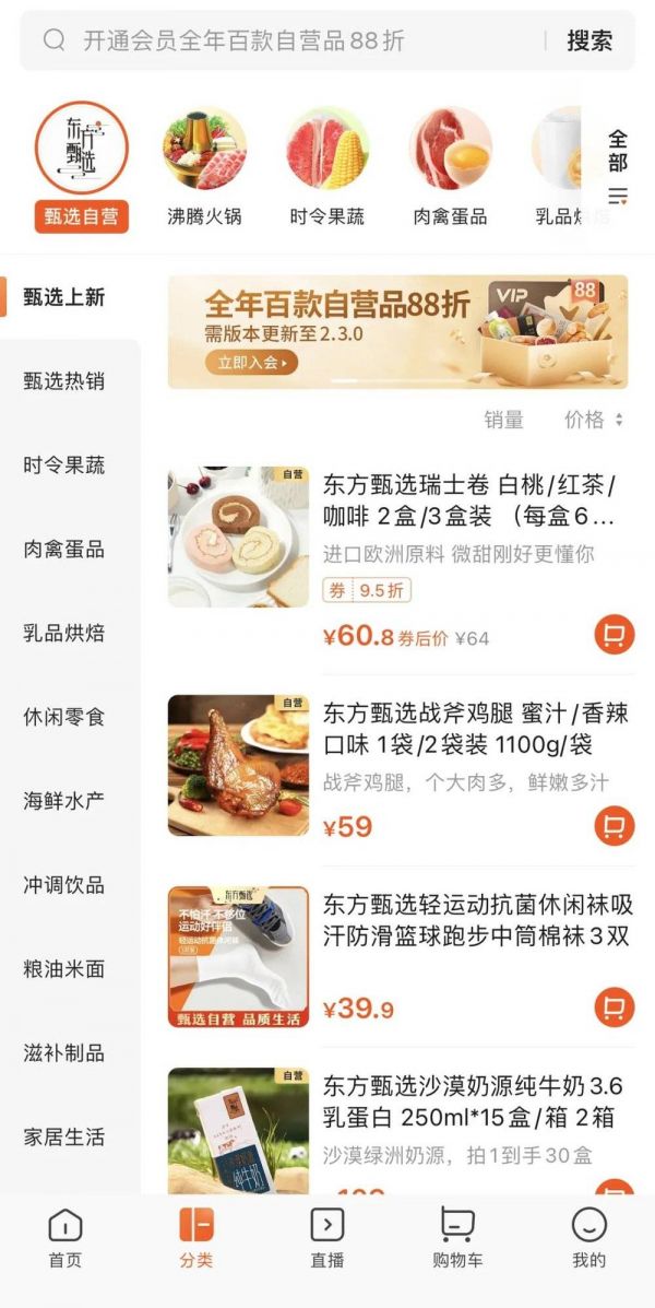 除了价格,还需要考虑APP的使用体验。目前东方甄选APP能提供的服务相对有限。整体的界面UI设计,与天猫超市类似,但界面更加简洁干净。“分类”和“直播”是底部五大版块之一,可见其优先级。