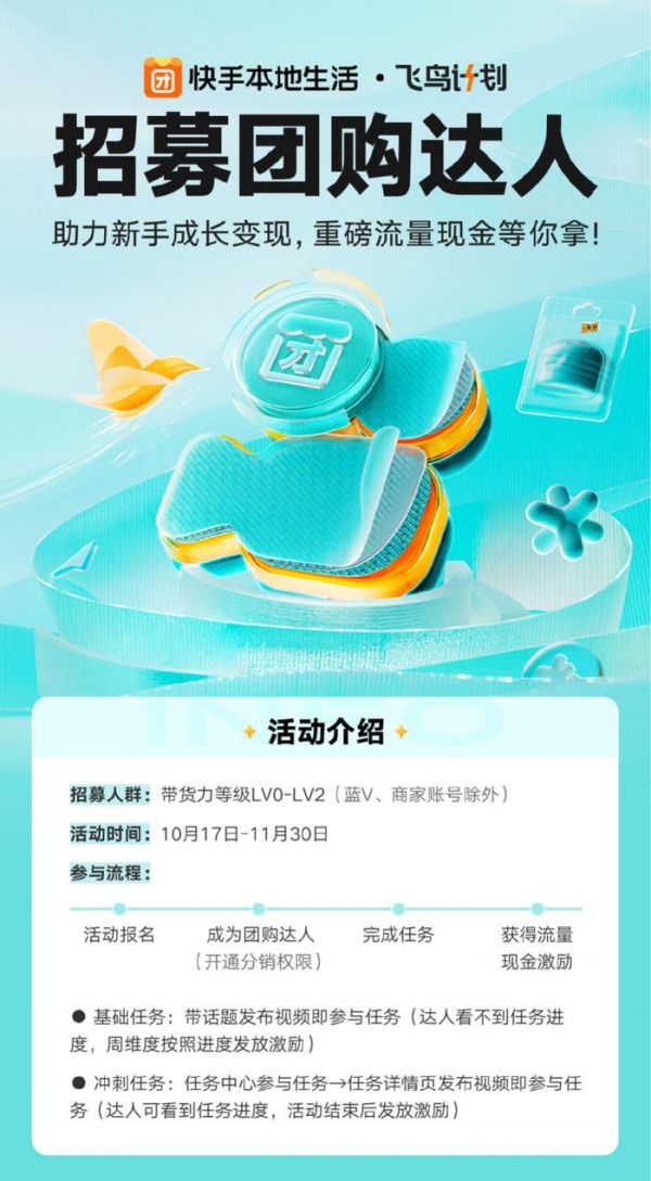 为了抓住双11的流量机遇,在新阶段获取到更多的发展机会。10月17日,快手正式上线了“飞鸟计划”第二期活动,通过持续释放更多流量及现金激励,并放宽参与门槛,助力达人成长。