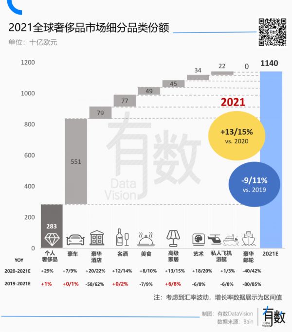 其中,豪车、个人奢侈品、豪华酒店合计占据了这个市场的80%。但在过去三年里,豪车和个人奢侈品扛起了整个市场增长的大旗,豪华酒店的业绩直到2021年才开始逐步翻身。