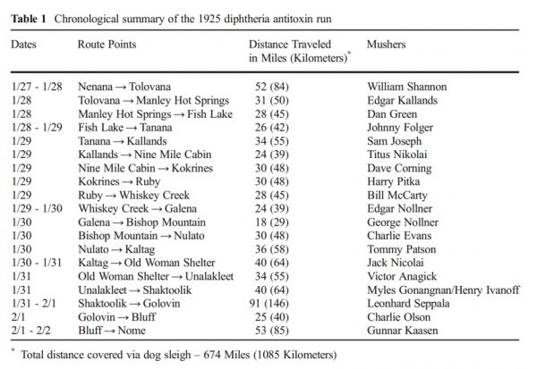 [4]Aboul-Enein BH, Puddy WC, Bowser JE. The 1925 Diphtheria Antitoxin Run to Nome - Alaska: A Public Health Illustration of Human-Animal Collaboration. J Med Humanit. 2019 Sep;40(3):287-296.
