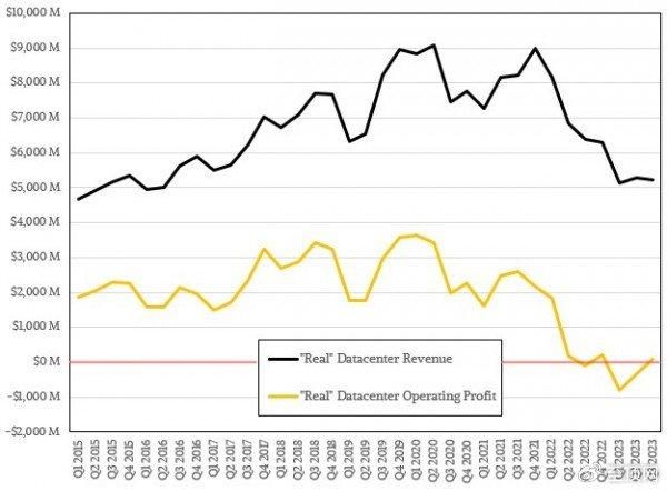 曾经见证过英特尔在2000和2010年代辉煌与荣光的朋友,肯定很难预料短短十年间其数据中心业务就会跌破图中的红线、陷入运营亏损。