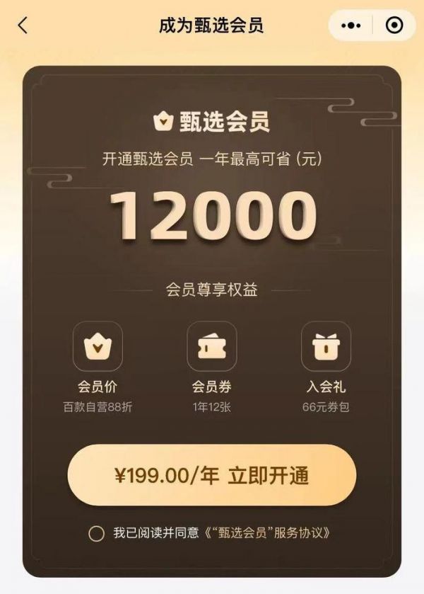 价值199元一年的甄选会员,一年净省12000元。(图/小程序截图)只是对于其他普通消费者来说,无论前摇多长,东方甄选本质上仍然是一个带货直播。别看观众们嘴上说着厌倦了诸如 " 把价格打下来 " 之类的话术,但到了结账的时候,谁又不想和主播做家人?