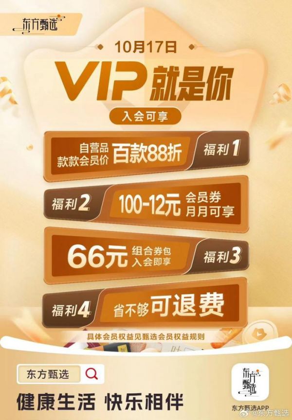 10 月 17 日,距离今年 " 双十一 " 不到一个月的时间,东方甄选正式在自己的 App 推出付费会员服务。199 元的年费涵盖了百余款自营产品 88 折、一年 12 张非自营品优惠券(满 100 元减 12 元)、66 元入会限时券包三项权益。