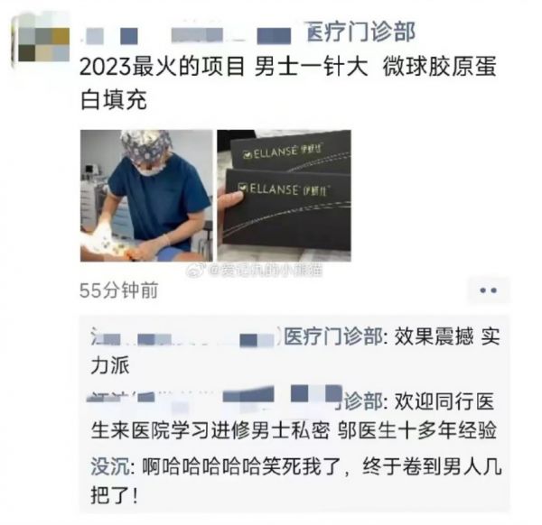 “2023最火的项目,男士一针大,微球胶原蛋白填充”,“效果震撼,实力派”。上述措辞来自10月31日一张在各大社交平台广泛流传的朋友圈截图,该截图显示发布者为某医疗门诊部,让诸多吃瓜群众感叹,“(整形手术)终于卷到男人XX了!”