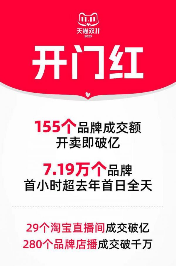 10月31日晚8点,天猫双11正式开售,155个品牌开卖成交即破亿,首小时7.19万个品牌成交额超去年首日全天。