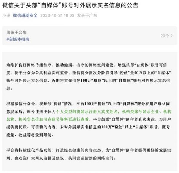 根据微信公众号、视频号“粉丝”情况,平台100万“粉丝”以上的“自媒体”账号在用户确认同意展示后,账号注册主体为个人类型的将显示注册人真实姓名,机构类账号显示企业、机构名称,相关实名信息可在账号资料页进行查看。未对外展示实名信息的100万“粉丝”以上“自媒体”账号,账号流量、收益等将受到限制。