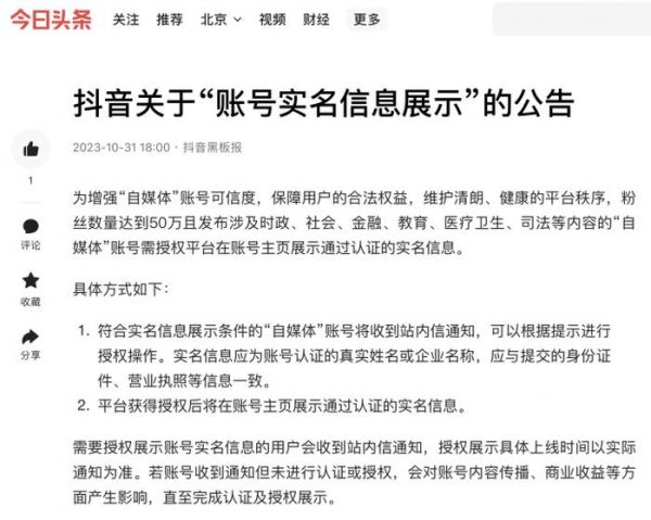 抖音发布公告称,“粉丝”数量达到50万且发布涉及时政、社会、金融、教育、医疗卫生、司法等内容的“自媒体”账号需授权平台在账号主页展示通过认证的实名信息。