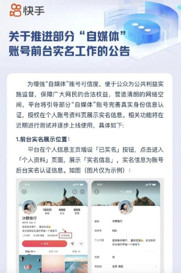 快手官方公告称,平台将引导部分“自媒体”账号完善真实身份信息认证,授权在个人账号资料页展示实名信息。相关功能将于近期进行测试并逐步上线使用。