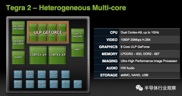 2011 年 1 月,英伟达正式推出了第二代 Tegra 芯片即 Tegra 2,这一代芯片用上了台积电最新的 40nm 工艺,内置两颗频率为 1GHz 的 ARM Cortex-A9 核心,配备 GeForce 架构的双核 GPU,同时还搭载了英伟达自研的音频解码核心与视频编码处理单元。