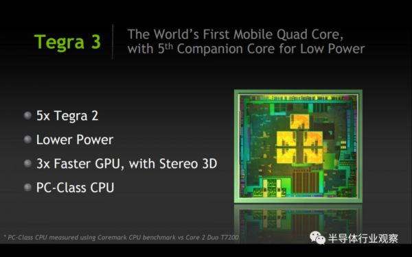 2011 年 11 月,英伟达发布了 Tegra 2 的继任者 Tegra 3 处理器,不仅搭载全球首款四核 ARM Cortex A9 CPU,还有升级过后的 12 核 GeForce GPU。根据英伟达的宣传,该处理器图形性能最高可达 Tegra 2 的 3 倍,功耗却比后者低 61%。