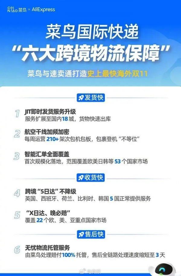 10月25日,菜鸟再度联合速卖通发布了主打发货快、收货快和售后快的“六大跨境物流保障”,并表示将通过物流技术规模化应用与物流基建升级,让今年的海外双11实现史上最快。