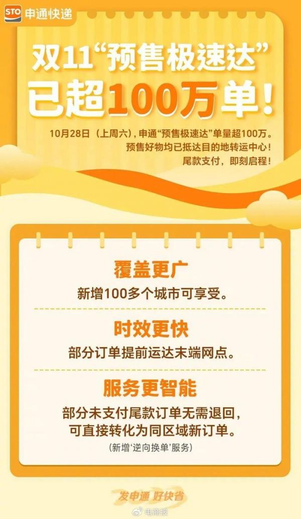 具体来看,三通一达方面,各自有各自的发力点。10月30日,申通官方宣布,“预售极速达”单量超100万,预售好物均已抵达目的地转运中心;中通快递与淘系电商平台,以及抖音、快手等签署了 2023 年“双十一”物流运营保障协议,成为“双十一”期间特邀物流合作伙伴。