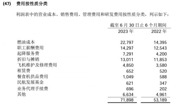 以南方航空为例,2023年上半年财报显示,上半年南方航空的营业收入为718.3亿元,营业成本为668.99亿元。在营业成本构成一项中,餐食机供品费用为10.49亿元,占总成本的1.56%,去年同期为5.88亿元,同比增长78.40%。