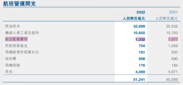 对比2022年和2021年财报发现,南方航空2022年航班营运开支为512.4亿元,其中航空配餐费用为13.3亿元,占比2.6%;2021年,航班营运开支为455.7亿元,其中航空配餐费用为15.7亿元,占比3.46%。