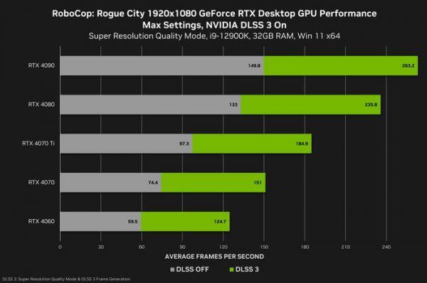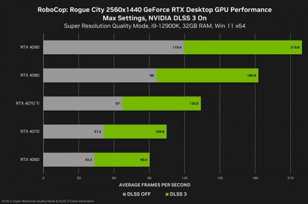 在 1440p 分辨率下,性能平均可提升至原来的 2 倍,使所有 GeForce RTX 40 系列台式机 GPU 都能在最高设置下以超过 60 FPS 的帧率运行“机械战警:暴戾都市 (RoboCop: Rogue City)”,RTX 4060 即可实现 2K 90.4fps。