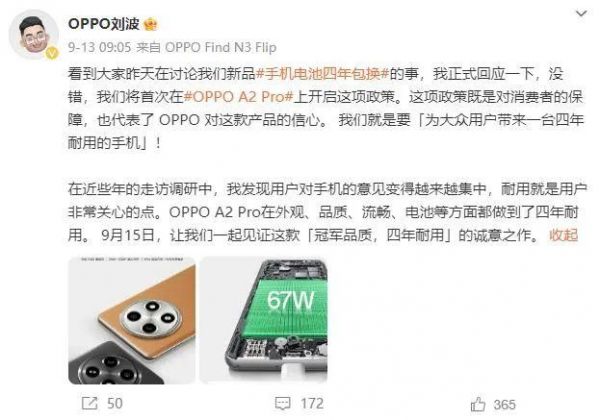 OPPO中国区总裁刘波在个人微博上回应称,就是要为大众用户带来一台四年耐用的手机。其后他的一段话算是道出了厂商的真实想法,“在近些年的走访调研中,发现用户对手机的意见变得越来越集中,耐用就是用户非常关心的点。”