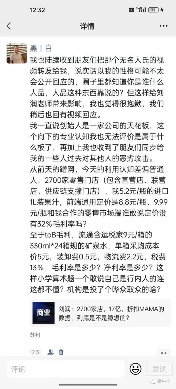 马昕彤:正常啊 我也觉得正常啊 如果都叫折扣妈妈 2500家店 17亿 32%没问题啊,问题是不到十家店 剩下的说是B2B,你作为一个供应链企业32%毛利?现在又给我说32%是你合作门店的毛利?你把2500家店用你erp或者统一收银系统的截图给一下。我给你和刘润鞠躬道歉。你搜地图全国能搜到不超过10家。