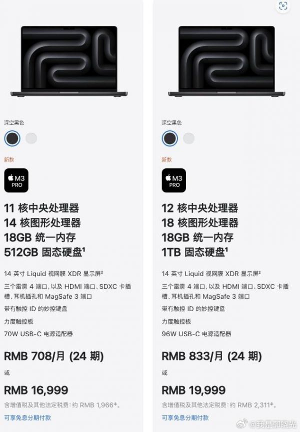 14寸MBP:8+512是12999元、8+1TB是14999元,而18+512(M3 Pro)为16999元;18+1TB(M3 Pro)是19999元