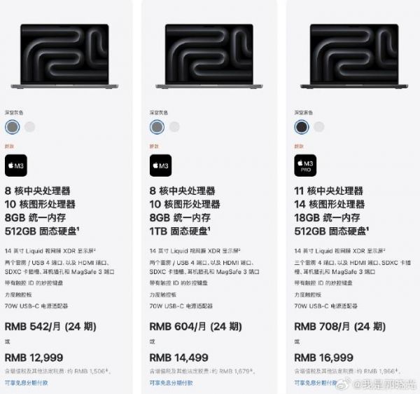 16寸MBP:18+512GB(M3 Pro)是19999元、36+512GB(M3 Pro)是22999元、36+1TB(M3 Max)是27999元、48+1TB(M3 Max)是31999元。