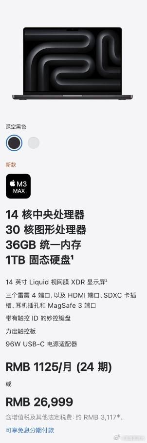 14寸MBP:36+1TB为26999元,搭载的处理器是M3 Max。