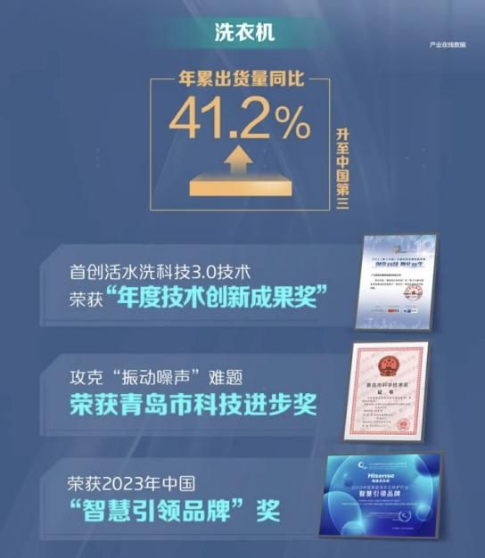 海信洗衣机以消费者洗护新需求为导向,不断强化洗护科技的创新和产品体验的升级,持续为全球用户提供更多更好的洗护产品。来自产业在线的数据显示,2023年前三季度,海信洗衣机年累出货量同比增长41.2%,升至中国第三。