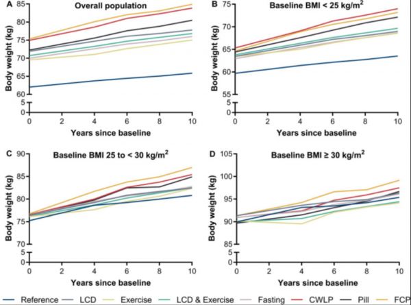 不同基线BMI的减肥策略和体重变化趋势之间的关系,图源:PLOS