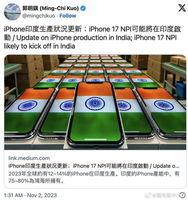 【#苹果将首次在印度研发新iPhone产线# 印度制造比重曝光】天风国际证券知名分析师郭明錤今天发布报告称,iPhone 17标准版将于2025年下半年发售,它的新产品导入(NPI)将于明年下半年在印度展开,这将是苹果首次在中国以外的生产线开始新款iPhone的研发。选择标准版iPhone的原因是设计开发难度较低,可降低设计风险。