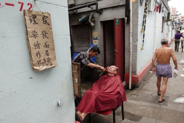 弄堂风情之二:理发, 周家牌路依仁里普爱坊。(摄影/ 郑宪章)