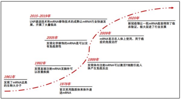 徐:在两年前的直播讲座中,我曾分享过一张图,展示了从1961年到2020年间的mRNA技术的发展历程。