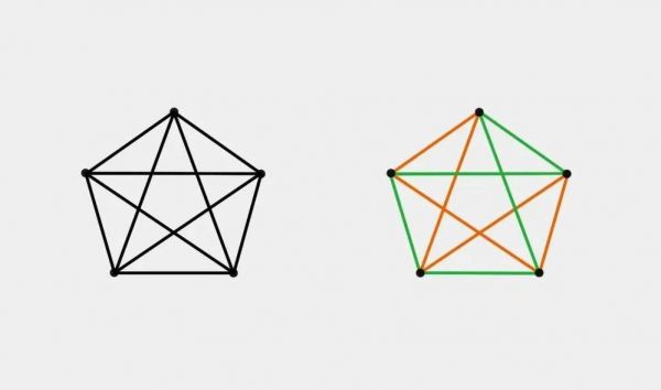 用两种不同颜色为由5个顶点连接而成的完全图的边着色,是有可能避免出现3个顶点由相同颜色的边连接而成的情况的。(图/原理)