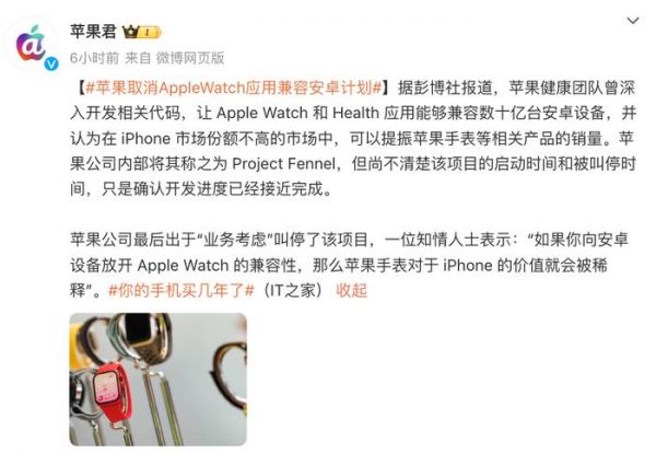 苹果健康团队曾深入开发相关代码,让 Apple Watch 和 Health 应用能够兼容数十亿台安卓设备,并认为在 iPhone 市场份额不高的市场中,可以提振苹果手表等相关产品的销量。苹果公司内部将其称之为 Project Fennel,但尚不清楚该项目的启动时间和被叫停时间,只是确认开发进度已经接近完成。