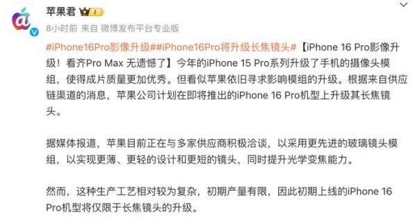 然而,这种生产工艺相对较为复杂,初期产量有限,因此初期上线的iPhone 16 Pro机型将仅限于长焦镜头的升级。