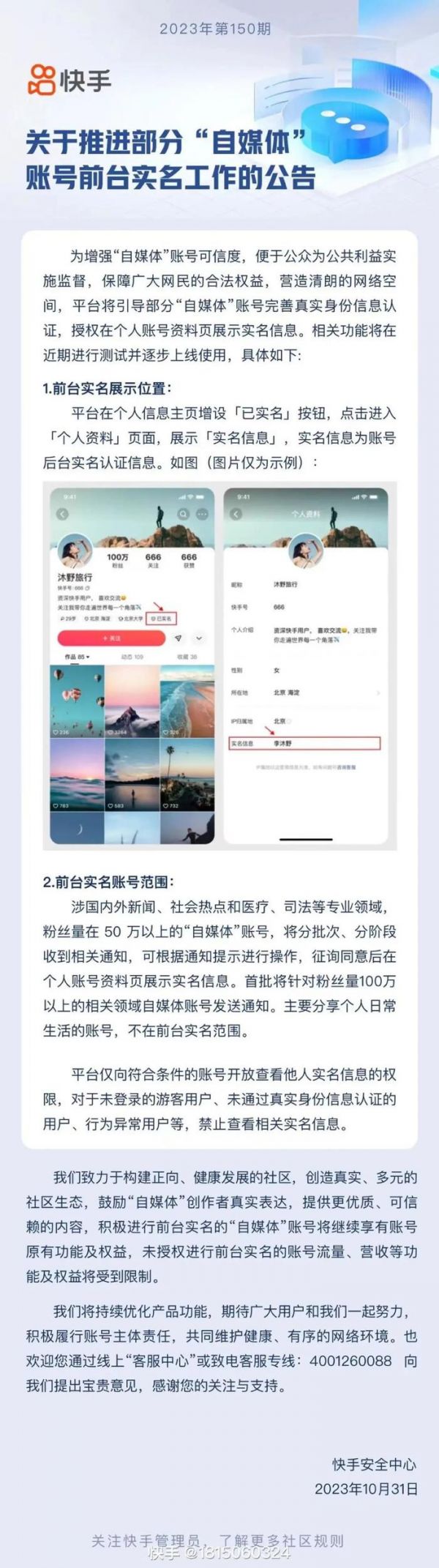 快手表示,首批将针对粉丝量100万以上的相关领域自媒体账号发送通知。主要分享个人日常生活的账号,不在前台实名范围。