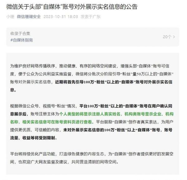 微信将分批次分阶段引导“粉丝”量50万以上的“自媒体”账号对外展示实名信息,近期将首先引导100万“粉丝”以上的“自媒体”账号对外展示实名信息。