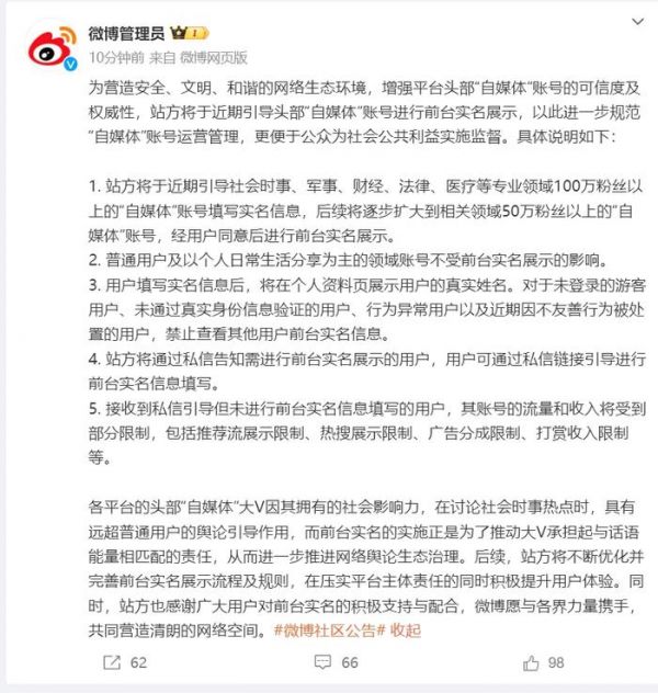 10月31日,微博管理员发文称,为营造安全、文明、和谐的网络生态环境,增强平台头部“自媒体”账号的可信度及权威性,站方将于近期引导头部“自媒体”账号进行前台实名展示,以此进一步规范“自媒体”账号运营管理,更便于公众为社会公共利益实施监督。