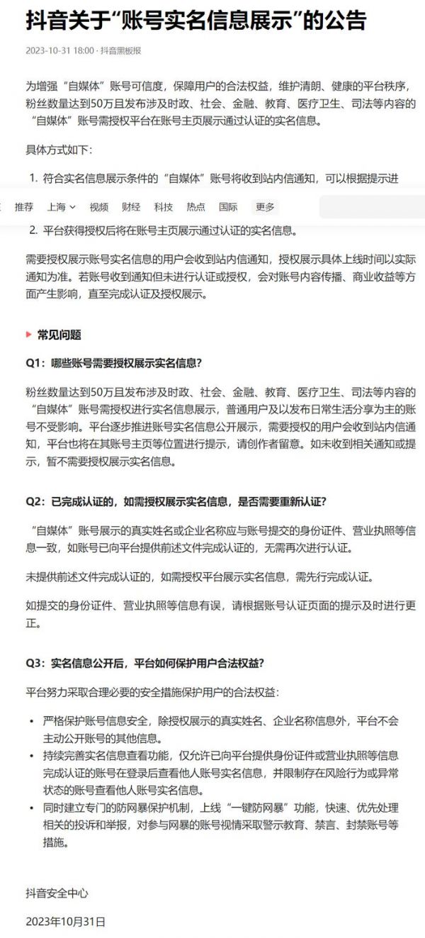 关于头部“自媒体”账号前台实名的公告